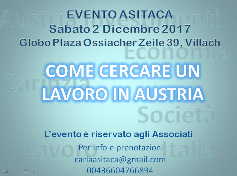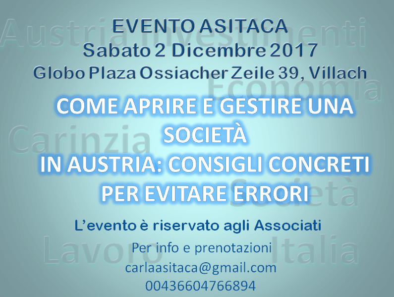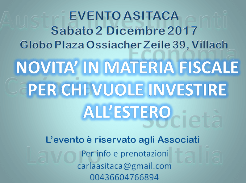 Presentazione dell’evento ASITACA del 2 dicembre 2017. Come aprire una società in Austria Come cercare lavoro in Austria Novità in materia fiscale per chi vuole investire all’estero Come aprire e gestire una società in Austria Come cercare lavoro in Austria Novità in materia fiscale per chi vuole investire all’estero Condividi:FacebookTwitterGoogleLinkedInMi piace:Mi piace Caricamento...